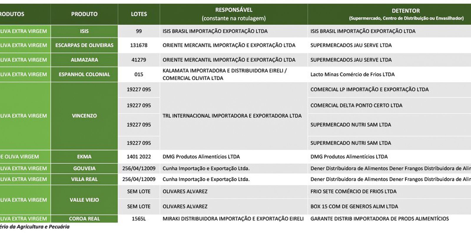 O Ministério da Agricultura e Pecuária determinou o recolhimento de 12 lotes de azeites de oliva que estão impróprios para o consumo. A medida, anunciada nessa quinta-feira (21), foi tomada após a confirmação – em análises laboratoriais – de que os produtos não correspondem aos padrões de identidade e qualidade estabelecidos por regulamento técnico.