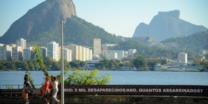 ONG Rio de Paz questiona o governo do estado sobre os desaparecidos no Rio de Janeiro em faixa instalada na Lagoa Rodrigo de Freitas – Foto: Tomaz Silva/Agência Brasil