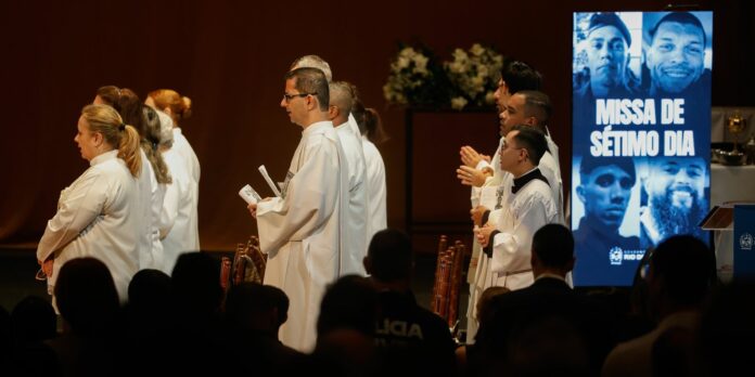 Foi celebrada nesta quinta-feira (6), no anfiteatro do Theatro Municipal do Rio, a missa de sétimo dia dos quatro policiais mortos na Operação Contenção, no dia 28 de outubro, nos complexos da Penha e do Alemão.