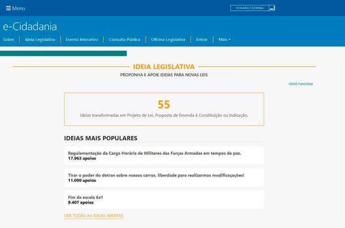 Criada em 2012, a ideia legislativa foi a primeira ferramenta do e-Cidadania. Qualquer cidadão pode enviar essas ideias (que podem, inclusive, ser transformadas em projetos de lei).