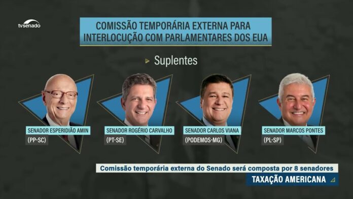 O Senado definiu nesta quinta-feira (17) os integrantes da comissão temporária encarregada de dialogar com o Congresso dos Estados Unidos sobre a nova tarifa de importação aplicada a produtos brasileiros pelo presidente Donald Trump. O grupo viajará para Washington, nos Estados Unidos, entre os dias 29 e 31 de julho, durante a última semana do recesso parlamentar brasileiro.