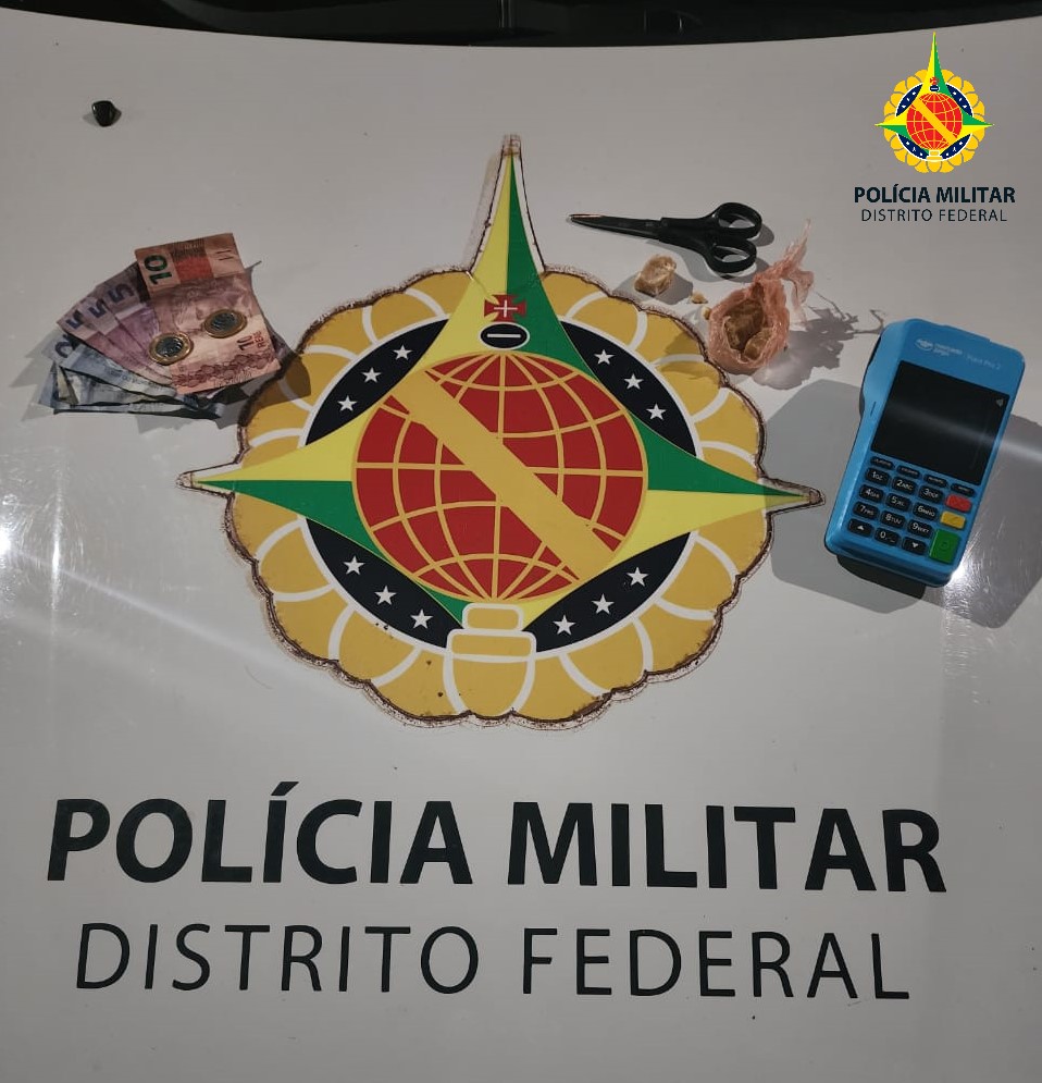 Ao perceber a aproximação dos policiais, o homem tentou esconder uma grande pedra de crack jogando-a no chão, mas sem sucesso. Na busca pessoal, foram encontrados R$ 33,00 em dinheiro e uma máquina de cartão bancário.