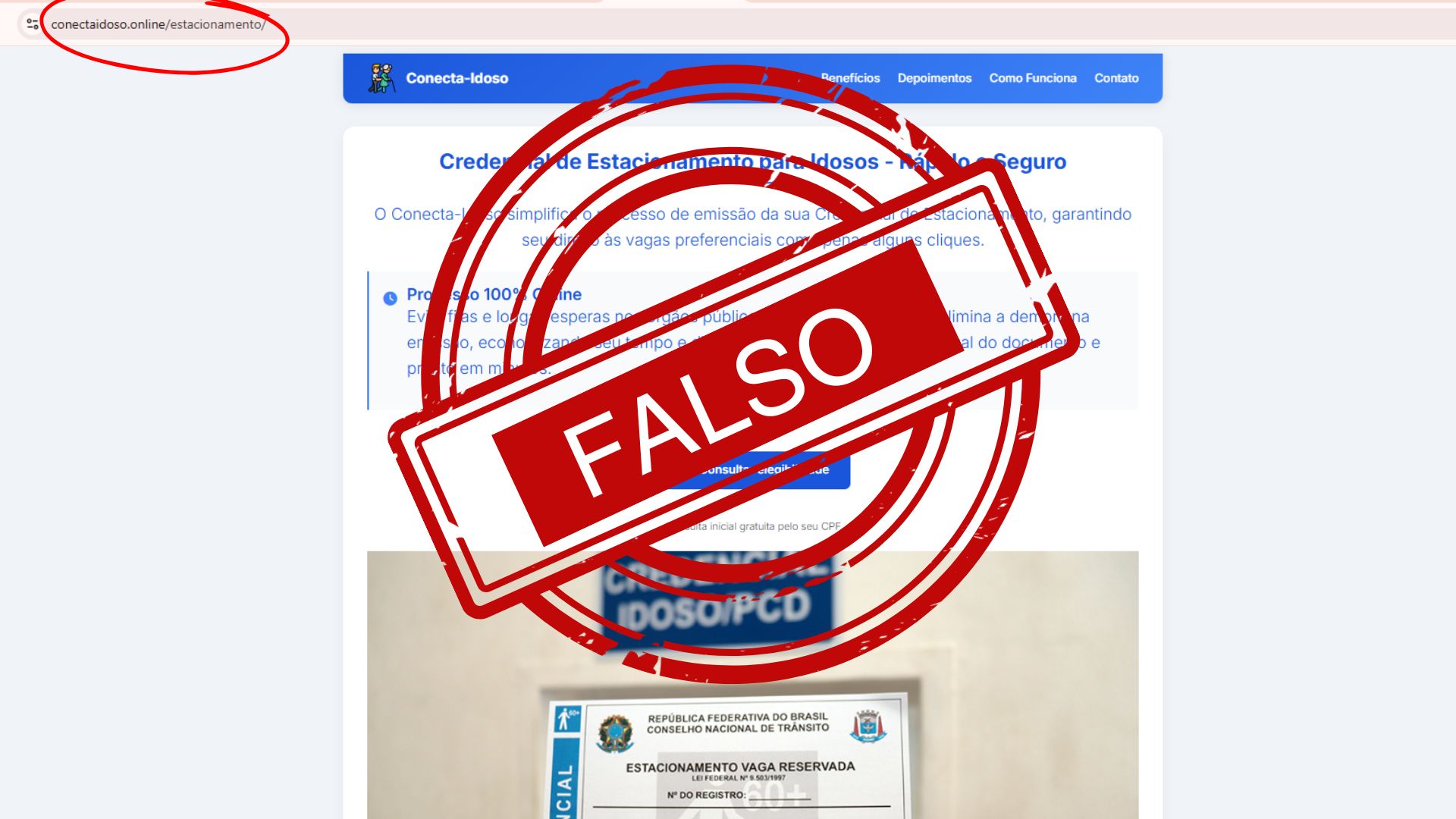 Um site falso chamado “Conecta Idoso” se apresenta como credenciado pelo Detran-DF. Após inserir o CPF do idoso, o usuário recebe um e-mail solicitando pagamento via Pix para emissão da credencial. Os endereços identificados como fraudulentos são: