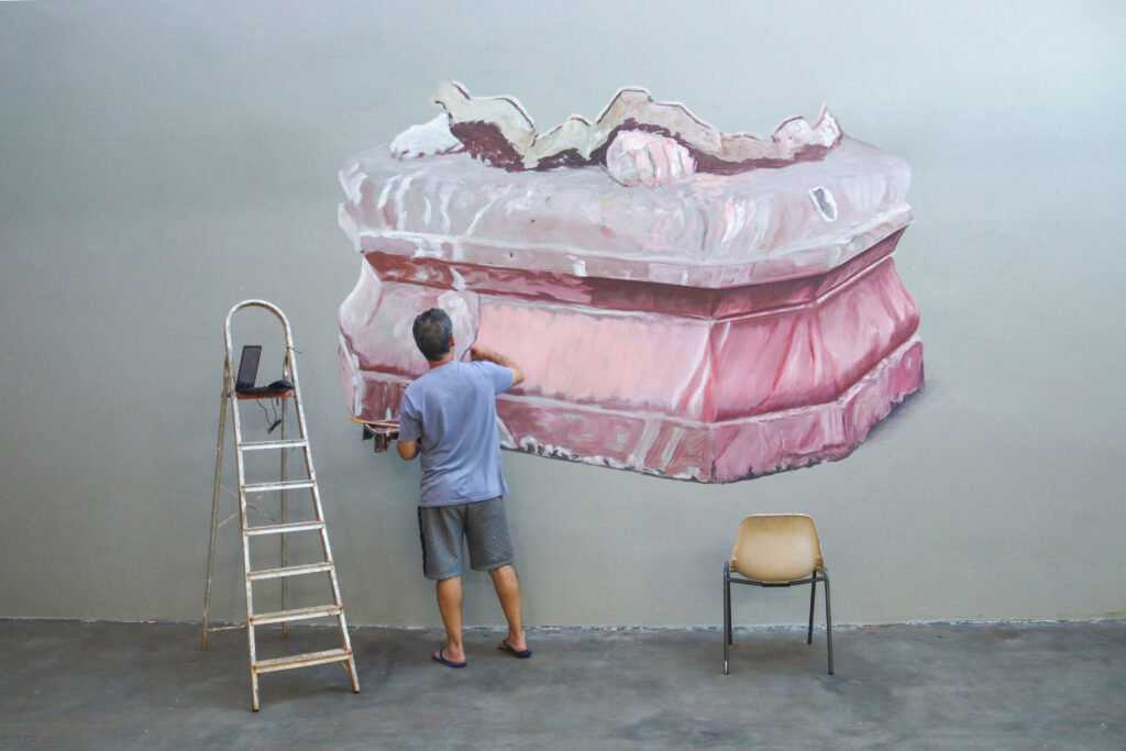 Durante o processo, os artistas compartilharam o espaço de trabalho e desenvolveram pesquisas que transitam entre o campo pictórico e outras linguagens.