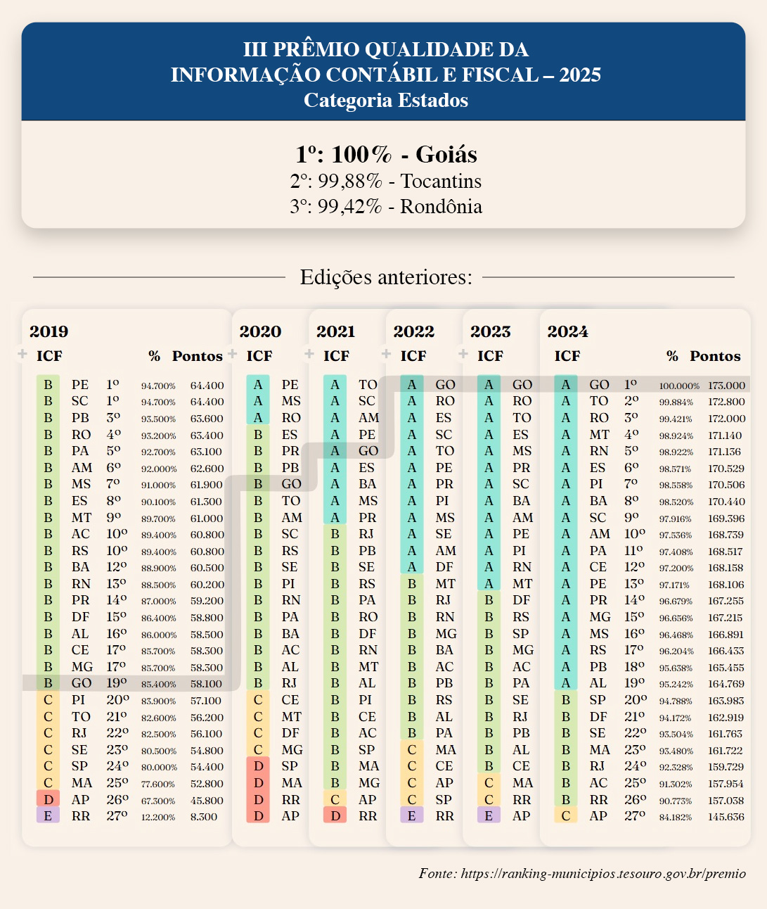 Em 2025, os critérios para a concessão do III Prêmio Qualidade Da Informação Contábil e Fiscal se basearam na pontuação obtida no ranking que avalia e classifica precisão, integridade, qualidade e consistência das informações contábeis e fiscais enviadas pelos entes federativos. Nessa análise são realizadas mais de 180 verificações em diferentes dimensões para avaliar a qualidade dos dados informados. Goiás atingiu 100% dos índices avaliados, alcançando, mais uma vez, o 1º lugar no desempenho geral entre os estados.